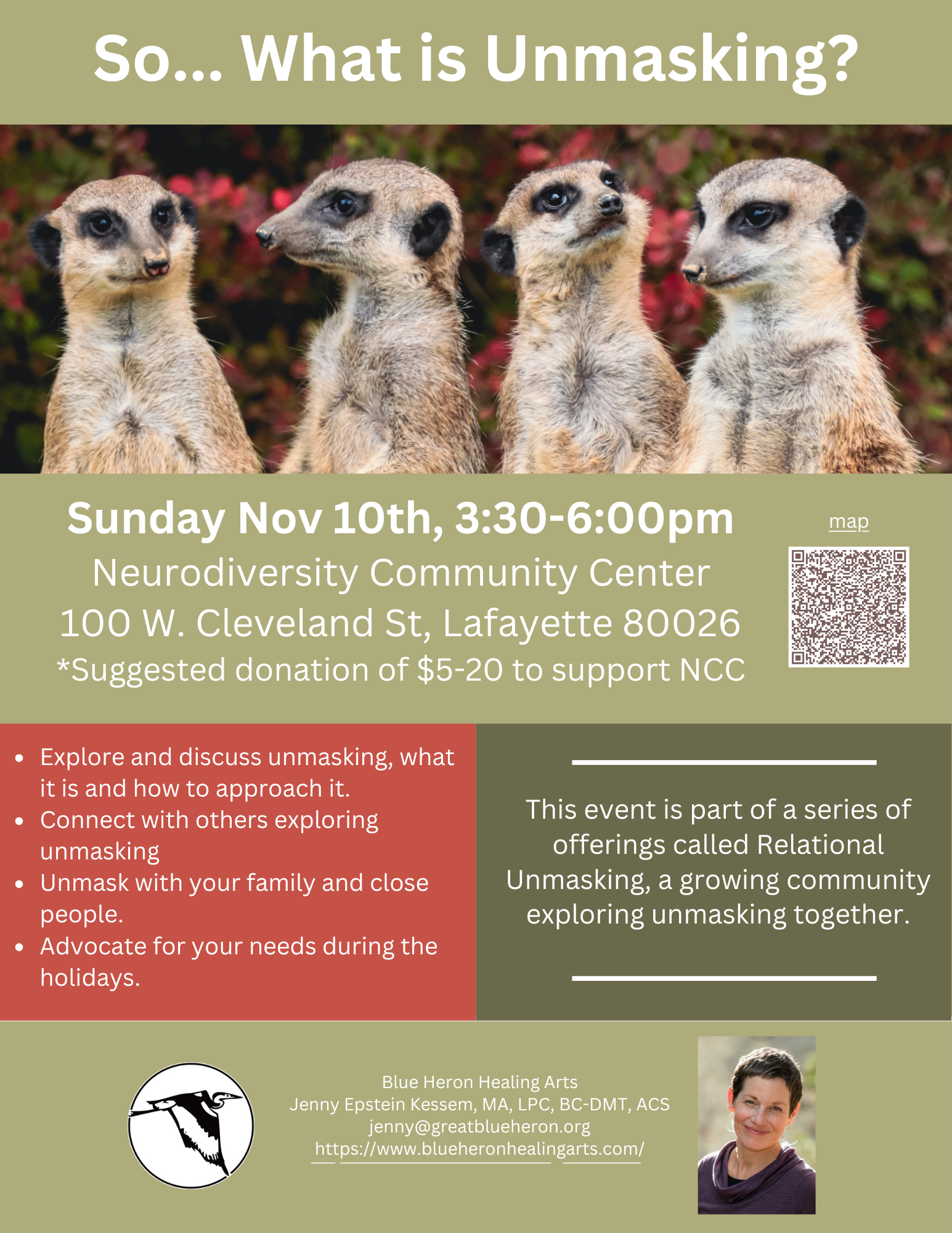 Learn more about Jenny’s work here: https://www.blueheronhealingarts.com/. And check out the upcoming event below!